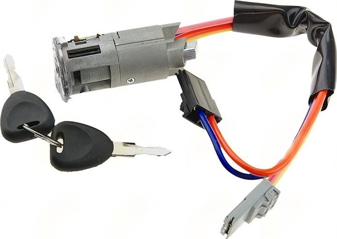 Zámek je mechanický, ten vsunutím kovového kolíku v ose zámku zajišťuje volantovou tyč. K němu je přisazen elektronický spínač, který spojuje dva páry vodičů.